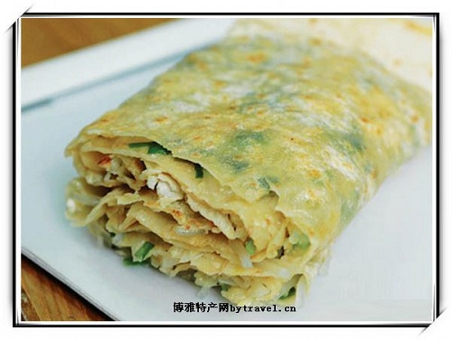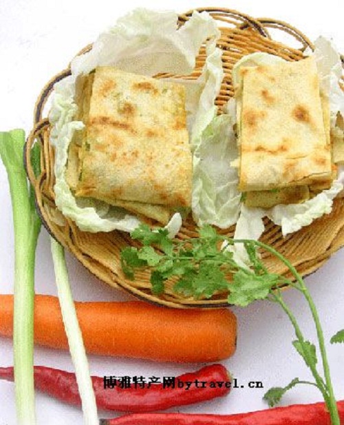 煎饼过去为淄博南部淄川、博山等地人民的主食,菜煎饼是传统 吃法之一,堪为一绝.