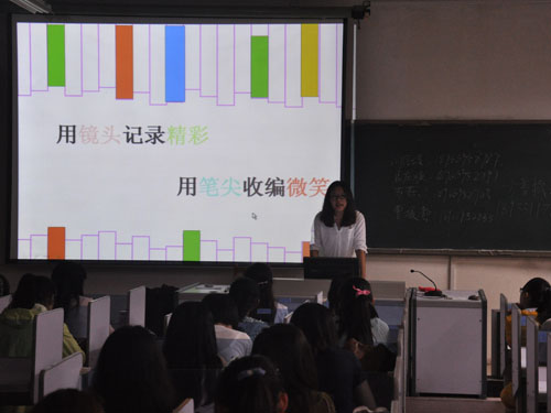 动员会议现场,在主席团的带领下,学院学生会分成四个小分队轮番在四个教室进行动员。首先,学生会各部门相关负责人向新生做自我介绍,并以PPT为主要依托将其部门职能、主要工作、部门成员及分管主席等具体情况以独特的方式展现出来,图文并茂,加之发言人的即兴演讲,趣味十分,将各部门风采表现得淋漓尽致。互动交流环节中,新生就所感兴趣的部门进行相关提问,相关负责人的耐心解答使新生们更加渴望加入学生会,锻炼自己的能力。