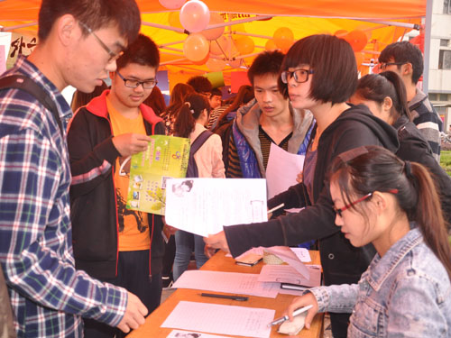 10月12日上午,学校数百个社团于大学生艺术广场打响纳新第一枪,活动现场人潮涌动,十分火爆。我院借其独有的语言及女生多的优势成立的四大社团——英语辩论协会、外文之声协会、朗读协会以及礼仪与彩妆协会积极参与其中。