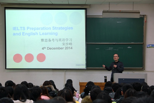讲座上,宋步峰以国际与国内英语学习的差异为切入点,将国际与国内英语考试的目的、形式及内容进行对比,以明确备考同学的学习方向。基于对雅思考试15年的了解与研究,他为同学们详细介绍了雅思考试流程及分值分配,并提出从生词、场景及语法三方面入手备战雅思,同时有机结合个人学习经验及能力,逐步摸索适合自身的备考雅思的思路与方法。对于雅思考试中分值较重、较难掌握的听力、阅读及写作,宋步峰建议同学们着眼于各类考题目的的分析,进而展开更具针对性的训练。此外,他强调,备考雅思是个循序渐进的过程,其间明确、高效的学习计划与坚持不懈的精神必不可少,而对异域文化与风俗的深入了解同样不容忽视。
