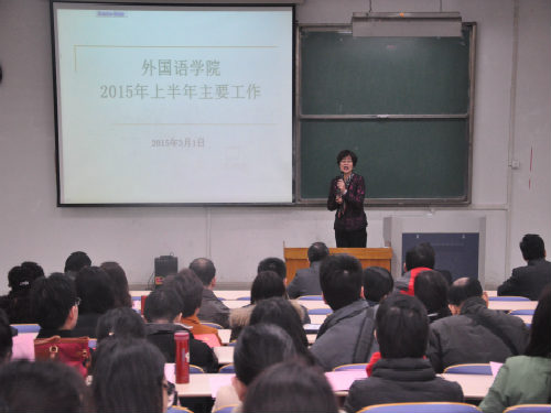 会议主要包括两项议程,一是总结2015年上半年工作成果;二是部署新学期主要工作。会议伊始,院长李静就山东省高校改革分析其对学院教育教学工作的影响,并表示学院学科建设虽取得重大进步,但学科能力仍需加强;对于学院环境卫生问题,她要求进一步加强管理力度,力争将“保护环境,人人有责”的目标深入人心。随后,李静针对新学期主要工作提出,全体教职工要以“教学秩序正常,williamhill稳定”为基本准则,确保学院各项常规工作正常进行;稳步推进大学英语教学改革,加强教学信息化建设,努力培育优质教学成果;继续加强科研师资队伍建设,积极开展与校内外优秀青年教师的联系;启动“williamhill中国外语实训中心即语言服务中心”的建设;修订职称评审文件;积极准备,助力第六届“外教社杯”全国高校外语教学大赛山东赛区比赛工作。