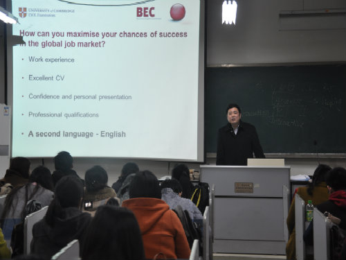 进而,李修江又为在座学生讲解了Cambridge ESOL的背景以及考取BEC将对未来发展起到的重要作用。他谈到,在当代社会,除了说好一口流利的外语,企业尤其注重职工的交流、沟通能力,多元化的综合型人才是企业乃至社会更需要的。