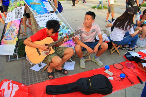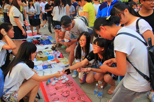 “跳蚤”摊位虽小,货物却琳琅满目,从教辅资料、期刊杂志到衣装饰物、生活常备,近二百个摊位打造起小商品购物天堂。为招揽顾客,卖家们用尽浑身解数,各种吆喝声层出不穷,“买一赠一”“三样折一”“买就送”“喜欢就送”甚至“不买也送”的口号都打得响亮;有些商家则利用吉他弹唱、音响播放、喇叭宣传等吸引买家,尽显其商业头脑,为现场增添几分热闹气息。值得一谈的是,各国留学生也积极参与活动,将各国特产、文化作品、奇葩玩物等与众人分享,成为此次跳蚤市场上的一大亮点。