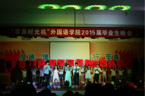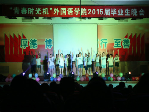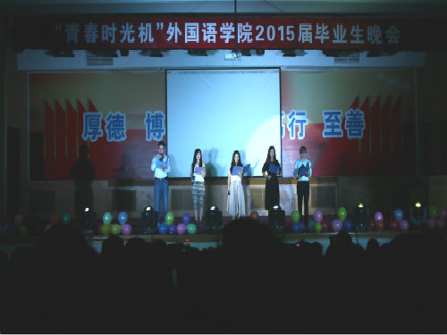 一曲《温柔》娓娓道出四年的细腻情感;而方言版《再别康桥》则带给观众截然不同的感受,河南、四川、淄博……来自各地的同学们在此处合作演绎出不一样的康桥,引得观众们笑声不断;教师们则用一支热闹十分的秧歌为毕业生们送上真挚祝福。“来吧,昨天今天碰个面”主题课间插入时下流行的朋友圈、QQ动态消息截图,通过今昔对比,回顾青春时光,再现毕业生们的成长历程。同时,2015届优秀毕业生通过寄语视频向学校、学院表达真挚情感,为学弟学妹们送上祝福。