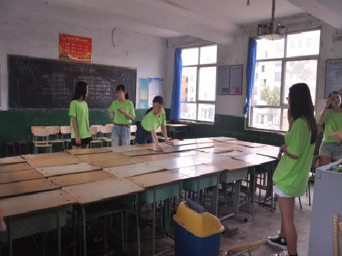 我们住在当地小学,下车以后发现在当地挂职的卢书记早已在李家户镇中心小学等着我们了。到达这里的第一件事就是整理“宿舍”,大家把各自的行李都搬到了教室里,几十张课桌拼在一起就是我们的床铺,凳子就用来放杂物,讲台就是我们的梳妆台,原本乱糟糟的教室瞬间被我们几个女生收拾的井井有条且富有生活气息,三个男生是住在医务室里。更重要的是我们发现了角落里的空调,这让我们甚是欣喜。可是刚刚有点成就感的我们接着就被一个“噩耗”打击到了:这里不能洗澡。这对爱干净的女生们来说简直是致命的。