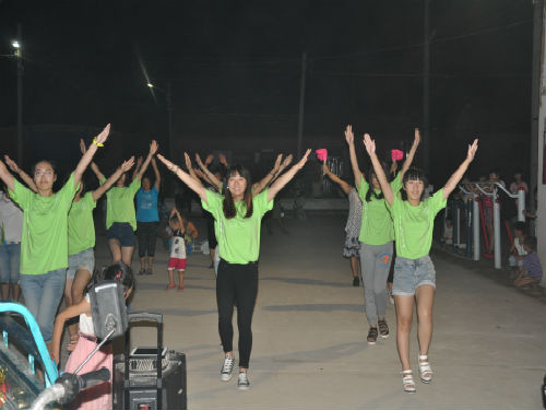 应广大村民的要求,吃过晚饭后我们在卢书记的安排下去了巩庄村,教大妈们跳广场舞。大妈们看起来都比较内敛,不善言辞,但是随着小苹果、泉水叮咚等音乐的响起,大家都跟着我们的领队翩翩起舞起来。还有一些肢体不协调的同学真是手脚并用,做出来的动作生硬滑稽,惹得大家发出一阵阵的笑声。最精彩的就是巩庄村村支书的夫人带领他们的团队排的一支扇子舞,六个人配合默契,姿势优美,队形变换流畅,尤其是扇子在灯光下反射出来的光,在夜晚的小广场上像闪烁的星星一般美丽。这精彩的舞蹈引来大家一阵阵的叫好声。还有一些大妈强烈要求让我们教她们跳交谊舞,我们学过的同学就一个人带一个,大妈们学的特别认真,我们又过了一把当老师的瘾。