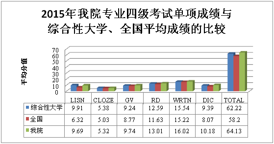 2015年,我院共176名学生参加英语专业四级考试,通过率达到80.11%,比全国多出28.32个百分点,比综合性大学平均通过率超出13.45个百分点。六个单项平均成绩均远超全国平均成绩,语法与词汇、阅读理解、写作、听写等四个单项成绩亦明显高出综合性大学平均成绩。优良率达到19.89%,比去年提高了7.56个百分点。