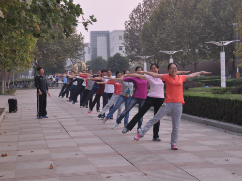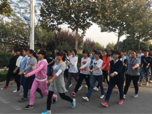 参与广播体操表演的教职工们自愿牺牲个人休息时间进行统一训练,