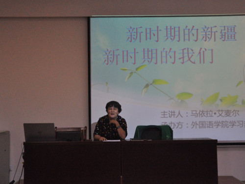 马依拉·艾麦尔以讲述自身求学历程及工作经历为切入点,鼓励同学们积极发扬新疆热情、善良、好客的品质,使新疆优秀的民族风情感染汉族同学;强调新疆教育建设需要同学们的奉献,不要忘记新疆的贫困地区,要通过自身双语优势促进新疆教育发展;希望少数民族与汉族的同学们团结互助,共创有特色、争先进的新疆班。随后,她与同学们分享作为一名特培生毕业后投入新疆工作的光荣与感悟,她坚信教育能改变一个人的人生轨迹,而教育工作者则是做出这种改变的重要力量;知其所需,明确责任,乐观宽容,积极上进,愿同学们脚踏实地,在校认真学习,掌握专业知识与技能,凭借自身能力获取劳动果实。最后,她提出对新疆班同学们的期望,希望同学们能以在我校学习为荣,劳逸结合,将自身价值带回新疆热土。真情动容的语言深深感染在场同学,赢得阵阵掌声。
