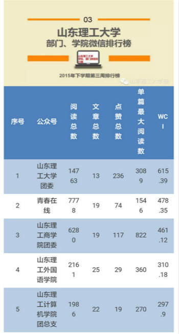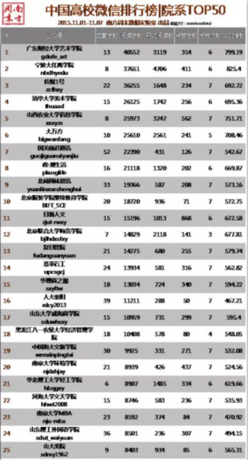 11月10日下午,微信公众号“南方周末数据实验室”更新消息,由学院新媒体工作室自主运营维护的学院官方微信“山东理工WilliamHill中文”(sdut_waiyuan)在中国高校微信排行榜之院系TOP50中荣获第24名的好成绩,这是我校首个院系微信公众号荣登该光荣榜;据校报最新统计,该微信平台位列全校院级微信平台第2名,学校第4名;近十天,推送信息日阅读总量三次破千,学院网络思想政治教育再上新台阶。 据悉,学院始终坚持以党的十八大精神及习近平总书记重要讲话精神为指导,按照共青团中央相关精神及校团委的工作部署,以“目标明确、特色突出、思路创新、技术到位、实效鲜明”为原则,领导重视,科学指导,团队合作,不断创新微信公众平台的运营模式。该平台自2013年4月创建,2014年12月着手改版、规范及宣传,2015年4月通过官方认证,微信平台教育工作全面铺开,推送内容以“知外院”、“专题栏”、“互动区”为自定义菜单,以“班级风采秀”、“微树洞”、科技竞赛活动等为特色专题,围绕“知·天下事”、“展·院风采”、“扬·正能量”、“观·外文窗”、“秀·趣生活”、“赢·在职场”六大板块展开,至今平台关注量、消息阅读量、转发量、点赞量日益攀升,新媒体服务水平得到广大师生的一致认可。(撰稿:朱岩)