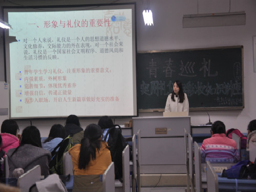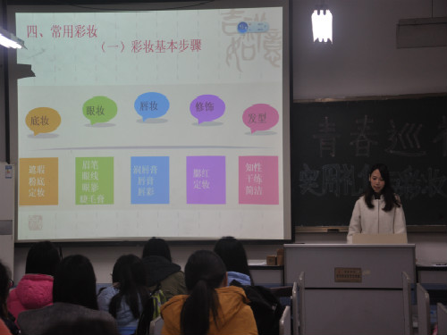华夏素有讲文明、重礼仪之风,为帮助同学们学习礼仪与彩妆知识,提高自身形象竞争力,11月13日晚,我院于8号教学楼112教室举行青春巡礼——实用礼仪与彩妆知识讲座。此次讲座由我院礼仪与彩妆协会主办,协会创始人张群担任主讲。