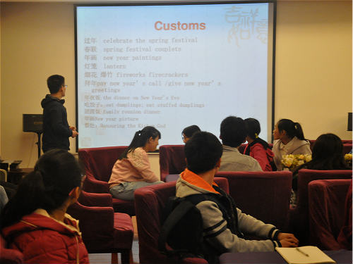 活动伊始,主持人以PPT形式展现活动交流主题,并以多样话题吸引同学们积极参与口语交流。于交谈中提高能力,于练习中展现自我,围绕“Customs of Spring Festival”这一主题,同学们与外国友人积极互动并进行深入交谈,畅所欲言,对主题积极进行扩展延伸,淋漓尽致中尽展口语魅力。随后,主持人提出“Family Reunion Dinner”等趣味话题,与外国友人的进一步交谈将现场氛围推向高潮,同学们踊跃发言,以流利口语讲述自身观点及经历,使同学们于自身口语能力提高之际充分了解传统文化之魅力,于语言独特风采中充实个人生活。此外,同学们积极交流口语学习方法,明确自身不足,借鉴他人学习经验,进一步提高口语水平及交流能力,现场氛围十分活跃。活动最后,外国友人讲到期待与同学们的再次相聚,此次活动在轻松的谈话氛围中结束。