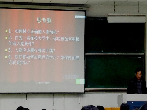 学生有序入场后,李义勇开讲入党启蒙教育。此次讲座共分两部分:“了解党、信任党、跟党走”及“争取入党的努力方向”。他借助图片,以90多年来党团结带领人民完成和推进的三件大事为例,向同学们展示党员队伍在曲折中发展的光辉历程。他还深入讲解党的根本宗旨与指导思想,同时鼓励同学们在生活中积极践行全心全意为人民服务的宗旨与党的指导思想,不断加强理论素养和政治修养。