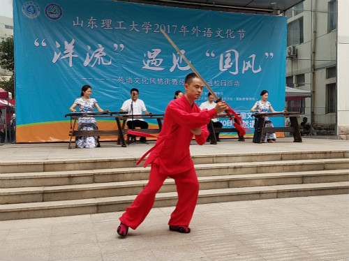 由沃盥、同牢、合卺等组成的汉代婚礼展示、“莲素”汉服表演中,绰约多姿的女子、儒雅风流的儿郎,穿梭历史时空而来。现场观众在中西文化的碰撞中感受民族文化韵味,领略外文魅力。古琴悠扬,瑜伽舒缓,非物质文化遗产“齐鲁琴歌”传承人曹玉梅,联袂现年62岁的空中瑜伽专业教练高素兰,带领观众们进行一次心灵旅行。张店区文化馆的教师们则带来一场旗袍走秀《荷香旗韵》,湖光潋滟,荷叶田田,曼妙身姿时隐时现,风情在婉约中摇曳。以剑和歌,世界功夫武术师范级七段、淄博市文化研究院院长汪峰,横剑如游龙穿梭,纵剑似鹞子翻身,与幽远琴声合成《卧龙吟》一曲。外国院学院学生也为开幕式献声,深情演绎多首外文歌曲,从经典英语曲目《Hey Jude》到甜美声线下的日文歌曲《Secret Base》,更有吉他伴唱的韩语歌曲《你不要担心》,青春嗓音迸发出年轻力量,火花四溅。