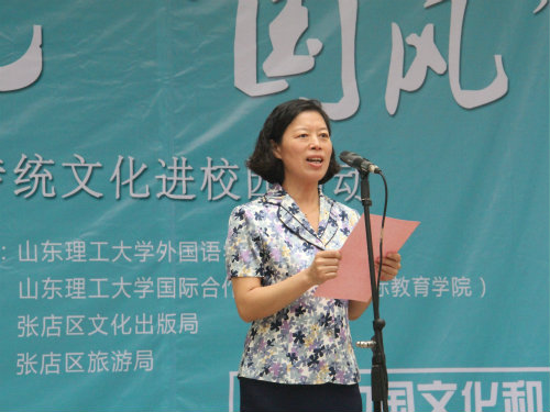 李新红此次活动致辞,简介风情街在外语文化节中的重要作用,开拓学生视野,感受异域文化的独特魅力。她更对张店区文化出版局、旅游局表示衷心感谢,指出此届风情街活动增加了“传统文化进校园活动”,让广大师生在不同文化元素的融汇交流中得到艺术熏陶与享受,提升了青年人民族文化自豪感与自信心。