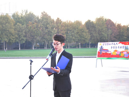 激昂国歌声响起,护旗手队列迈着坚定步伐走向升旗台,全体人员肃立行注目礼注视国旗冉冉升起,迎风飘扬。学生代表刘子林做主题演讲“学习贯彻十九大,争当五有好青年”。他提倡,青年学生要坚定理想信念、志存高远、脚踏实地,勇做时代弄潮儿,自觉做共产主义远大理想和中国特色社会主义共同理想的坚定信仰者、忠实者、实践者,发扬五有精神,使自己成为一名合格的共产主义接班者。