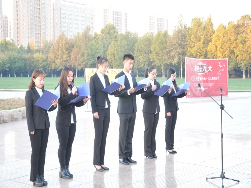 学院师生于国旗前庄严宣誓,声音铿锵有力。姜素锦总结讲话,学校上下正按照新规划的蓝图,认真贯彻落实校党委五有人才培养目标,为早日建成有特色、高水平、国内知名特色研究型大学而努力奋斗。她讲到,作为青年学生一要有坚定理想信念;二要有过硬本领,既钻研理论知识,又掌握实践技能;三要具备健康的身心,树立积极向上的人生观。在厚德、博学、笃行、至善的校训指引下,秉承内外兼修、中西贯通的学院理念,争做合格五有人才。最后,第十七届部分学生骨干代表齐诵《I have a dream》,朗诵者情绪饱满,抑扬顿挫的朗诵声在同学们耳边回荡。