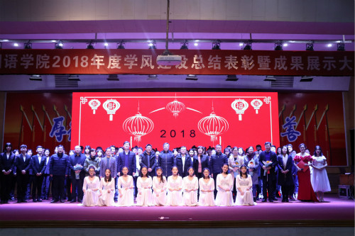 表彰过程中,形式多样的节目穿插其中:学生为学院优秀教师代表献上鲜花,表达对老师们最诚挚的敬意与感谢;汉、英、日、韩、德五国语言的诗朗诵搭配古典乐器古筝、二胡,中西文化的碰撞与交融带给观众不一样的视听享受;“五有”好榜样的的青春宣言铿锵有力、坚定自信,传递榜样力量,在激情昂扬的大合唱《年轻的战场》中,大会落下帷幕。