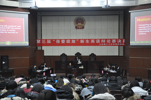 为进一步提高新生的英语学习热情,由我校社团联合会主办、英语辩论协会承办的第三届“蓓蕾绽放”新生英语辩论赛决赛于12月9日晚在模拟法庭举行。此次比赛邀请学院党总支副书记卢彦峰,教师徐南飞、张雷、乔伟荣及学生科全体教师作为嘉宾,外教高明馨,优秀教师李金凤、彭静及优秀学生代表姚梦茜、李征南等担任评委。