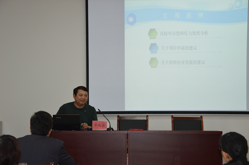 聘任仪式结束后,院长李静教授主持学术报告会。李常磊教授做了题为“压力与对策:外语教师发展与研究项目申报”的学术报告。报告内容包括高校外语教师压力现状分析、关于项目申请的建议、关于教师自身发展的建议共三部分。李常磊教授对高校外语教师压力表现形式与成因进行分析,认为教师应养成良好的心态、改变认知策略,正确对待自己的压力。随后,对项目申请有关事宜进行详细剖析,建议在进行项目研究时,从国家层面着眼,选取创新性的主题,突出研究的科学性、可行性与针对性,谋篇布局,精雕细琢;广大教师应积极加强自身专业发展,争取国际国内访学、培训、考博等机会,不断提高自身的教学科研水平。报告会后,李教授与学院教师进行了现场交流。