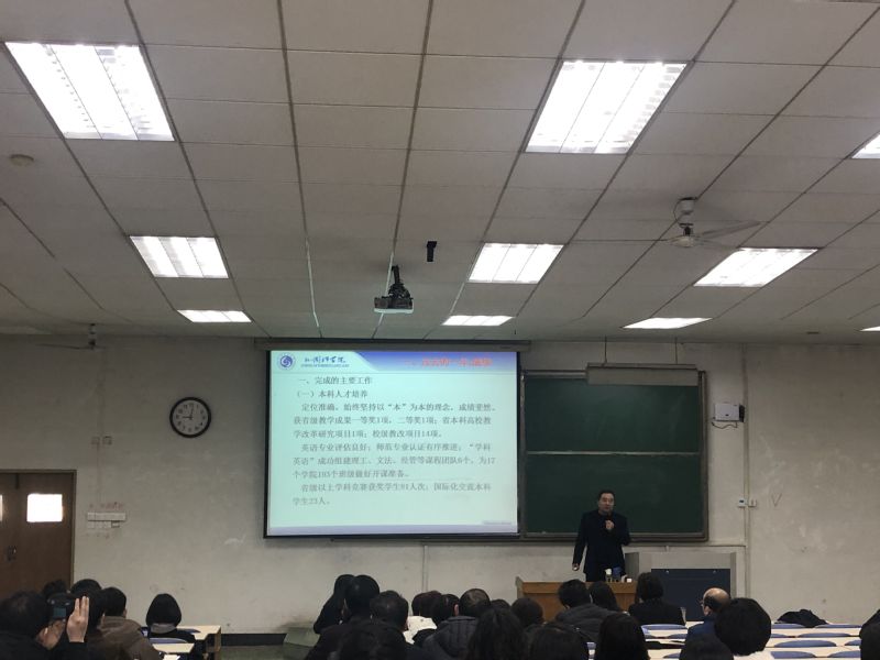 会上,院长王明新回顾了上一年的学院在本科人才培养、人才队伍建设、科研与社会服务、学科建设和研究生教育方面取得的工作成绩和任务目标完成情况,对当前学院面临的主要形势任务进行了分析梳理,并布置推进新一年的重点工作。王明新表示,2019年学院将坚持立德树人根本任务,大力实施人才优先战略,以提高教育教学质量为主题,以提升学科能力为主线,着力抓好师资队伍建设和翻译硕士学位点建设,同时坚持对外开放,拓展办学潜力,构建协同育人战略联盟,提升学院核心竞争力。他指出新一年学院将从扎实做好人才引进和科研推进工作、规范专业建设、深化学科英语教育教学体系改革等方面深入开展工作,以目标为引领,带领全体师生完成学院年度任务。