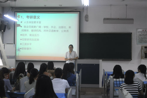 会议伊始,陶新慧结合自己的经历向同学们阐述了考研的意义,考研不仅使人生经验更丰富,也会使就业范围更广阔。