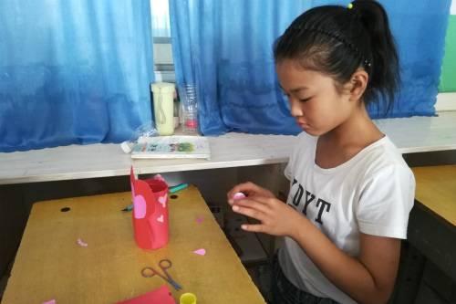 比赛正式开始,在“变废为宝―小小塑料瓶”环节中,各个小队成员奇招百出,队员为每位同学分发A4白纸,根据个人兴趣画日常生活中的人或物、动漫中的角色或是自己的奇思妙想,用做好的画装饰瓶子。随后,同学们使用所分发的颜料、彩纸等工具,开动脑筋,发挥想象,把一个个普通的塑料瓶,打造成了一件件异彩纷呈的艺术作品;在制作爱心贺卡环节中,同学们按照抽签组队,根据演示步骤,合作进行,各个成员依次陈述感恩的对象和理由,表达真情实感,将自己最想说的话写在贺卡上。现场气氛活跃。