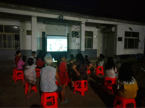 电影开播之前,实践团队员积极商讨适合村民和学生的电影类型,因考虑到八一建军节这一特殊日子,大家决定选取与保家卫国相关的影片,最终确定将要播放的电影为《战狼2》。晚饭结束后,实践团队员们各司其职,分工明确,带着电影播放设备一起去露天广场,学生们帮助实践队员摆好桌椅,实践队员也迅速行动,把投影仪摆好,设备连接好,一切准备就绪,等待村民的到来。电影开播,观众们聚精会神地观看影片。影片主要反应了当代中国军人牢记使命,在祖国与人民陷于危难之间时,勇于以身犯险,带领人民群众脱离苦难的精神。《战狼2》这部电影也重新唤起了人们对英雄的崇拜,对祖国以及中华民族的自豪感。就像中华人民共和国护照上所讲的“当你在海外遭遇危险,请不要放弃,记住在你身后有一个强大的祖国。”影片播放过程中,村民们被电影情节深深打动,在影片的高潮,部分老人异常激动,他们表示为军人点赞,为祖国自豪。