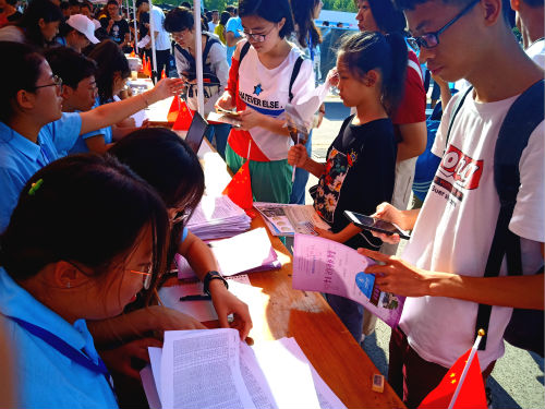 清晨,志愿者们准备就绪。学院学生会各部门分工合作,志愿者们有些负责接待,有些负责保管物资,有些收取材料,有些负责指引道路。他们将桌椅搬到三号体育场的营帐里摆放整齐,将条幅张贴平整,将展板排列美观,他们将为新生准备的各类材料、签名册、校园卡等物件排放在营帐不同板块,等待新生到来,为他们指点迷津,学院还设置了许多有趣的小环节,比如2019级新生照片墙、“缤纷糖果,甜蜜一夏”活动、外院修炼秘籍大发放环节等;在8号教学楼的志愿者尽职尽责,如有新生误走到学院,他们会提醒新生去三号体育场报道,他们会为新生说明他们的教室等;在学生公寓,志愿者与宿管阿姨配合默契,新生入学之前,各个班级就组织志愿者们将新生宿舍打扫干净,他们分发给新生宿舍钥匙、帮忙将新生的行李提到顶楼,热心告诉他们宿舍住宿事宜。他们热情洋溢,耐心为新生答疑解惑,这些志愿者身上真正体现了外院人“团结、友爱、互助、共赢”的精神。