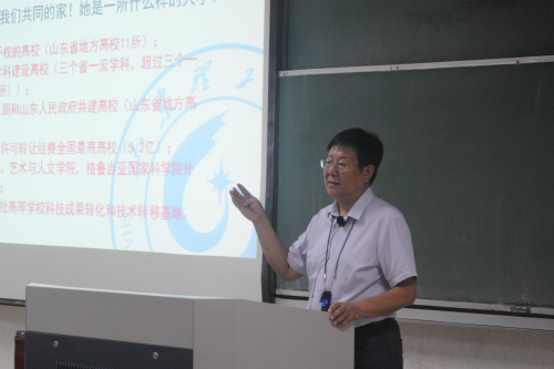 课堂开始,张铁柱从地理、资源、成就等方面的优势向同学们介绍了williamhill中国的情况。他引用德国哲学家黑格尔名言“凡是现实的就是合理的”,鼓励学生对母校充满自豪自信,以杰出校友为榜样,努力学习,成为优秀山理人。