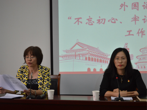 党总支书记李静首先向全体党员传达了学校《关于开展“不忘初心、牢记使命”主题教育的实施方案》和《吕传毅同志在学校“不忘初心、牢记使命”主题教育工作会议上的讲话》的重要精神,并解读了《WilliamHill中文党总支“不忘初心、牢记使命”主题教育工作方案》,对全院开展好主题教育活动作出安排部署,就主题教育的总体要求、目标任务、推进措施等方面进行详细说明。李静要求全体党员提高思想认识,充分理解这次主题教育的重大意义,积极参与到各项培训和活动中来;认真学习贯彻习近平新时代中国特色社会主义思想,自觉主动学、联系实际学,提高运用理论指导实践能力。她提出学院将着力抓实基层党支部主题教育,开展“外院先锋”党员风采展、庆祝建院40周年座谈会、校外党组织联合共建等活动,切实提高教育实效;不断丰富实践载体,依托领导班子联系系室、支部、班级、学生制度,“SFL·微党课”,“旗帜飘扬”党员主题教育活动等载体,组织党员立足岗位,履职尽责。