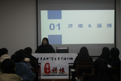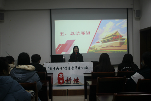 最后,董淑文给学生骨干分享的是大学的社会实践经历。她先后到济南开创公司、淄博雷霆睿英实验室、泰安新泰柳子沟村、北京调研和交流学习。 她给在座的学生骨干之后参与社会实践提出了两点建议。第一,努力去做团队负责人,学会克服一切困难,一个优秀的团队负责人要学会协调团队成员,做好分工,团队齐心协力。第二,老师是成长路上的领路人,应积极与老师做好沟通与联系。