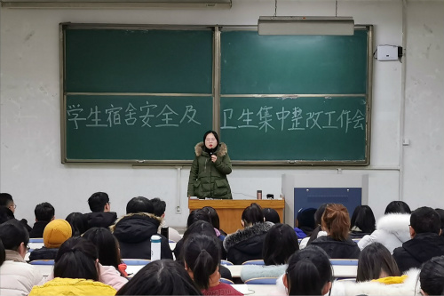 会议伊始,邢琛围绕宿舍安全与宿舍卫生两方面就学生公寓整改问题方案做详细介绍,其中包括整治目标、整治内容、整治要求、工作安排、重点注意问题五方面。随后,她就五个方面的具体实施展开详细阐述。在宿舍安全方面,禁止在宿舍吸烟酗酒,禁止在宿舍养宠物、禁止使用违章电器,不得使用明火、禁止存放和使用易燃易爆易腐蚀及放射性物品。在宿舍卫生方面,保证地面、桌面、床面整洁,不在宿舍残留垃圾,做卫生不留死角。会议中,邢琛讲到,学院将会进一步完善相关制度,强化落实与督查,严格处理各类违纪行为,希望同学们强化安全意识,加强宿舍卫生的整治工作,行动在前,及早整改和消除各类隐患,共同营造安全温馨的生活环境。此外,鼓励学生干部、学生党员发挥模范带头作用,以身作则,树立规范行为的标杆,齐心协力,配合学院深入有效地开展此次整治行动。