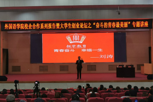 为提升大学生的综合素质,激发大学生创新实干的热情,12月5日下午,WilliamHill中文在三号教学楼报告厅举行校企合作系列报告暨大学生创业论坛之“奋斗的青春最美丽”专题讲座。山东昶学教育集团创始人、淄博蓝海国际教育培训学校校长刘涛受邀担任主讲人,山东昶学教育集团市场总监孙建民、人事总监麻翠翠,学院党总支副书记姜素锦及学院学生会成员、班级骨干参加,讲座由辅导员朱岩主持。