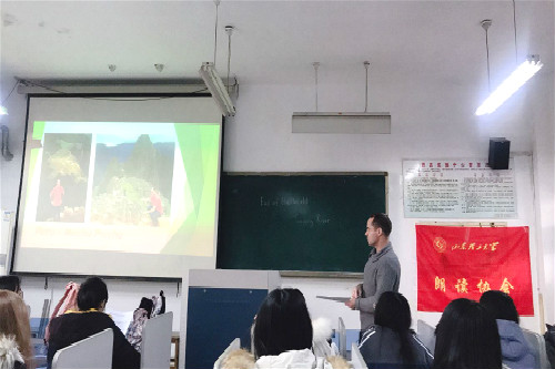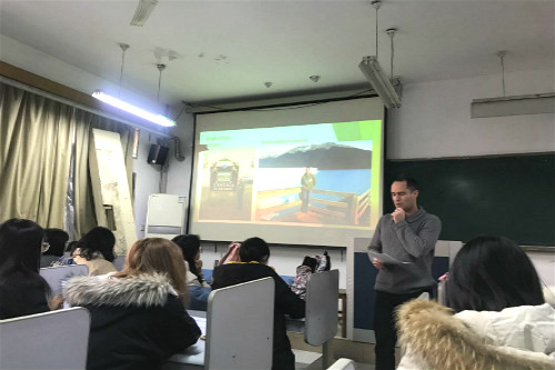 活动伊始,Dave以自己的旅游经历为主线,利用多媒体向学生展示自己旅游过程中所拍的照片与视频,同时对每个国家的文化进行详细讲解,让学生了解世界各地的文化历史与风土民情。从Dave对各个国家的介绍中,学生增加了对英语学习的兴趣,认识到学习英语的重要性。
