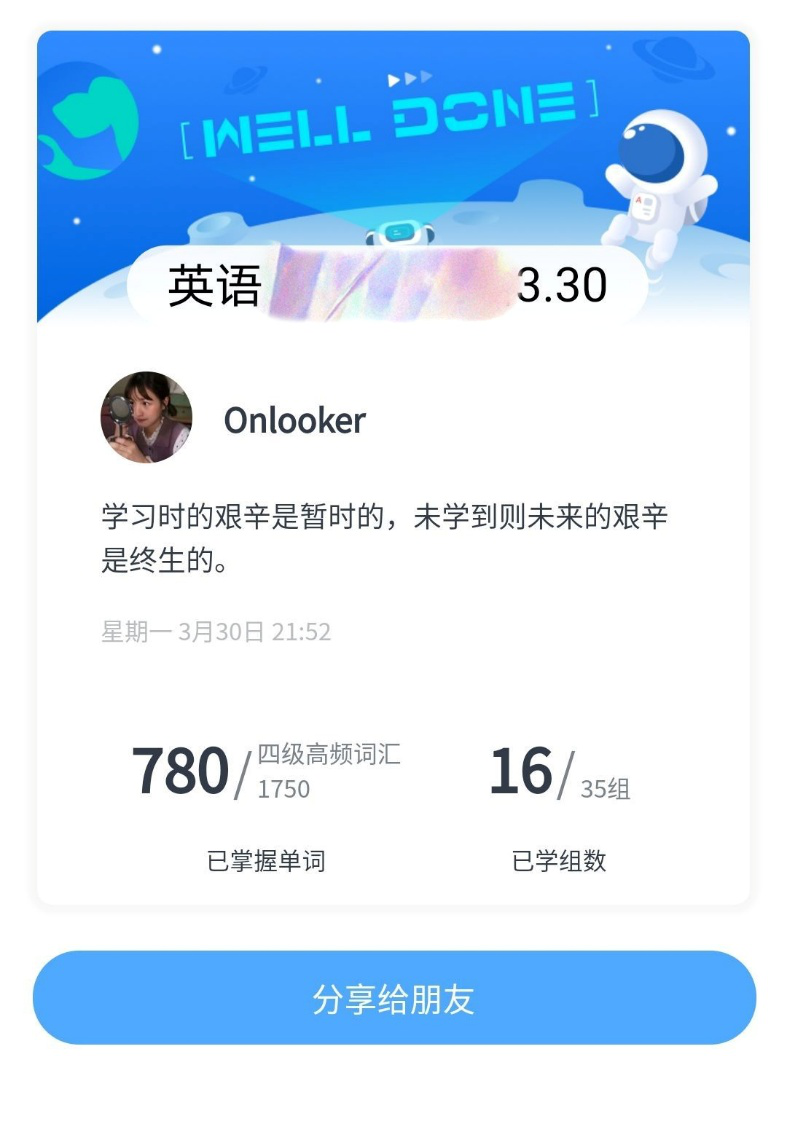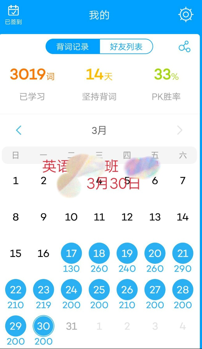 日复一日,每一天的数字都记录着同学们努力的成果。有的同学在打卡记录上还附有激励人心的话语,用这些话语鼓励自己坚持下去,努力下去。