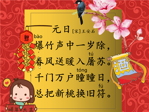 课程开始,赵瑞雪通过问题抛出的方式引导学生讨论,学生们兴高采烈地列举他们所熟知的节日习俗。接着,学生观看由中国唱诗班制作的动画片《元日》,他们情绪高涨,积极讨论并回答视频中的相关问题,课堂氛围被推向高潮。在此基础上,引入了古诗《元日》,她带领学生们学习了古诗中诸如“爆”、“屠”、“曈”等生僻字,并且对诗中所提到的“放鞭炮”、“饮屠苏酒”、“贴春联”等习俗进行了充分讲解。紧接着,她引导学生们联想作者王安石的作品《梅花》,学生们一齐大声背出了这首诗。初雪过后的寒冬里,三两人走在街巷,突然闻到飘出了一股淡淡的花香,他们追寻着香气,转头却看到了朱砂一般的石壁上伸出了朵朵梅花,想再往前进的时候,那香味却已变成了勾人食欲的食物香气。她指出,在古诗词的学习中要多注意古诗与古诗之间的联系以及古诗与生活的联系,这样可以帮助我们感受古诗的意境和作者的心境。