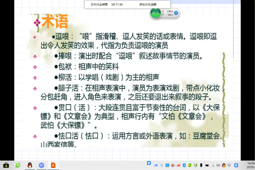 此次音乐课分为两部分。课程开始,高雪播放相声演员撩大褂的视频引出主题:“相声”,她向学生们介绍相声的定义、相声的起源、相声的术语、相声大师四个方面。她讲到,相声是曲艺形式之一,它最早是由俳优这种杂剧派别派生而来的,起源于北京,在咸丰、同治年间形成,由宋代的“像生”演变而来,到了晚清,相声初具现代相声的特点。此外,高雪还通过讲解古文《口技》,请学生们感受早期初具雏形的口技艺术。随后,她向学生介绍相声中的专业术语,例如:捧哏、逗哏、御子、醒木等等,普及相声艺术的知识,她表示,马三立先生、侯宝林先生是相声界泰斗,马三立的长子马志明先生也为相声的进步作出了极大贡献。讲解过后,两位学生主动上台表演儿童相声《吹牛》,两位小演员抖的包袱引人捧腹大笑,赢得满堂喝彩。