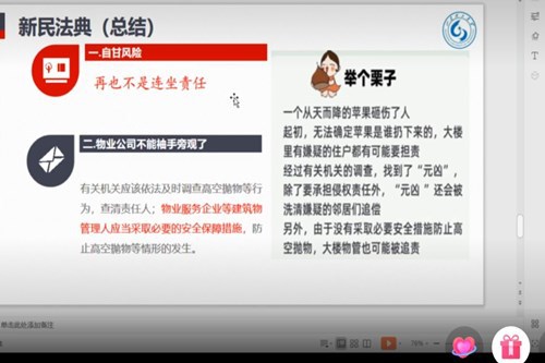 随后,刘屹详细解读新法典“高空抛物”法条。她提到,第一,民法典明确“高空抛物”是违法行为;第二,高空抛物中各主体责任更为清晰,民法典中新增追偿原则,可能造成损害的建筑物使用人应给予补偿,且对行为人享有追偿权;第三,物业等建筑物管理人需承担安全责任,采取必要安全保障措施。
