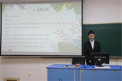 其中,候选人王晨旭通过“一生一务一任一义”八个字的简要概括,以轻松幽默的方式展现其专业成绩、专业竞赛、实习的优势,充分展示出候选人脚踏实地、努力上进的精神风貌。据悉,王晨旭共获得国家级四项、省级三项、校级七项奖项,2019年6月获得国家人事部英语三级笔译证书,2020年1月获得国家人事部二级笔译证书,2020年8月在省刊《科教导刊》发表论文。此外,其他各位候选人紧抓自身优势,讲述自身在大学生活中的所获所感。
