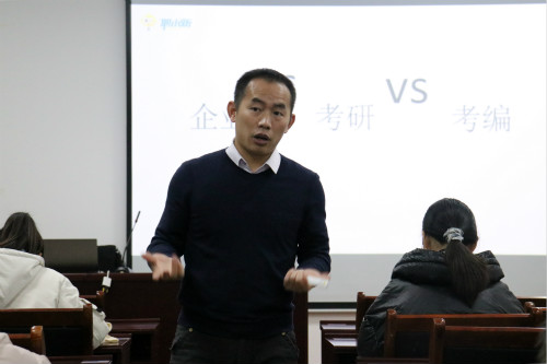 他围绕考研、就业、事业单位考试三大职业生涯发展方向,帮助学院学生明确目标设定,清晰今后努力方向。他带领学生逐条分析考研准备工作,为学生提供方向性指导,并建议同学积极争取保研名额;针对就业问题,他指出语言类毕业生专业能力不足、供需矛盾的就业困境,并利用大数据分析毕业生就业去向,对学院学生提出相关建议;对于事业单位考试,他建议学生制定考编时间规划,并现场解析国考真题,直观展示备考方向。