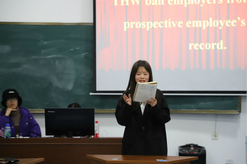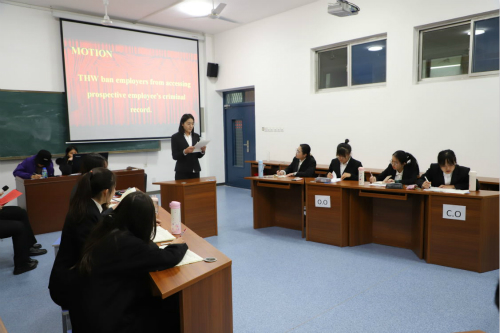 比赛伊始,主持人对比赛辩题及评判规则做简单介绍:此次比赛按照英国议会制辨论的形式展开,双方辩手需要围绕辩题This house would ban employers from accessing prospective employee’s criminal record."进行辩论。