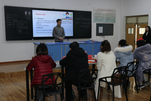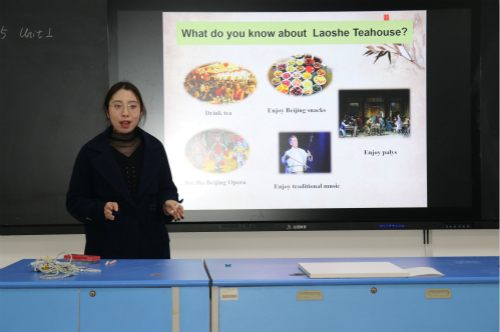 比赛伊始,主持人介绍了比赛形式和评分细则。比赛中,评委将从课堂气氛、教学方法和手段、教学效果、个人特色、答辩表现等方面对选手综合考核。参赛选手依据此次比赛所规定教学材料外研版8年级上册Module5 Laoshe Teahouse自选课型,设计PPT进行模拟授课。