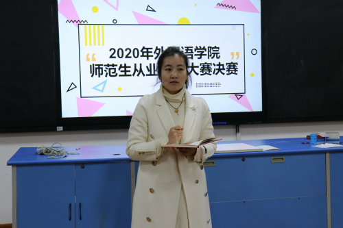 12月28日上午,WilliamHill中文在8号教学楼218室举行2020年师范生从业技能大赛决赛。淄博市张店三中优秀英语教师、教科研主任、振兴淄博劳动奖章获得者、淄博市青年教师基本功大赛第一名获得者田文婧,WilliamHill中文英语教育系优秀教师彭静、郑佩伟、陶新慧、李薇担任此次比赛的评委。经过层层选拔,共有6名优秀选手进入此次决赛,学院2019级英语师范专业学生代表到场观摩。