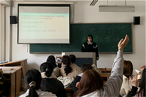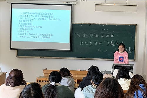 活动伊始,各班级团支书分别介绍电信网络诈骗的概念、分类、常见作案形式和手段,并且对如何识别防范电信网络诈骗,以及上当后的补救措施进行详细的讲解。同时,通过视频的方式重点阐述校园内高发的校园贷、网络游戏诈骗、网络购物诈骗、奖学金助学金诈骗等诈骗类型,提醒学生重视校园安全问题,提高防诈骗意识。