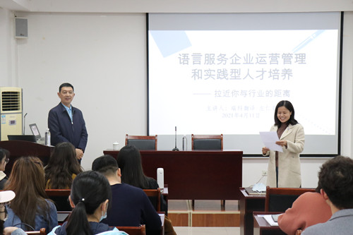 4月11日下午,我院在8号教学楼418教室举行“语言服务企业运营管理和实践型人才培养——拉近你与行业的距离”专题讲座,瑞科翻译公司联合创始人兼总经理左仁君受邀担任主讲人,学院党委书记李静、副院长张燕及学院师生参加。
