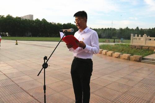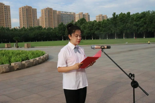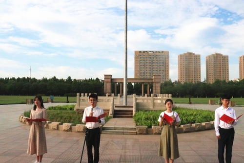 接下来,物理与光电工程学院和外国语学院的学生代表吴昌蔚、张曦、韩政洋、张紫航在国旗下深情朗诵,“中国共产党是先锋队、是播种机,是我们事业的核心力量……”句句有力,字字铿锵,表达了对中国共产党的深深赞扬与无限敬意。