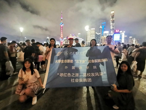之后,实践团成员来到了上海外滩。外滩位于上海市黄浦区的黄浦江畔,即外黄浦滩,1844年(清道光廿四年)起这一带被划为英国租界,成为上海十里洋场的真实写照,也是旧上海租界区以及整个上海近代城市开始的起点。外滩是这座东方大都会最著名的景观,由于其独特的地理位置及近百年来在经济活动领域对上海乃至中国的影响使其具有十分丰富的文化内涵。如今的外滩人声鼎沸,街灯繁华,LED灯展示出的“庆祝中国共产党建党100周年”在夜景中熠熠生辉。实践队成员表示“曾经的上海外滩是法租界,如今的外滩每一幢高楼上都插上了五星红旗,这是党领导人民取得胜利的有力见证!