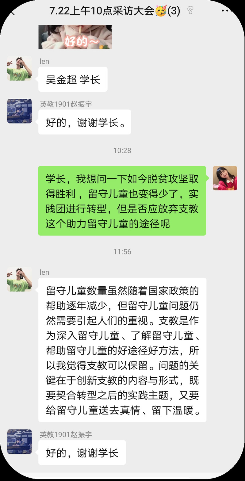 随后,对于社会实践过程中的重要条件,李虎认为沟通是最重要的因素之一。他提到,良好的沟通能让前期构画的实践内容焕发生机,遇到突发状况也能够协调解决。因此,不论是实践队员之间,和学院指导教师之间,还是和实践地的乡镇工作人员,和支教调研的对象等等,每一方的双向沟通都是必不可少的。
