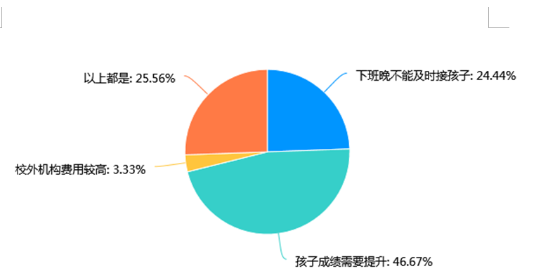 通过数据分析,我们发现乡村地区课后教育需求的产生主要是以下几个原因引起的:一、孩子的成绩需要提升。二、家长下班晚不能及时接孩子放学。三、孩子成绩提升与家长下班晚等综合因素。其中因孩子成绩需要提升而让孩子参加课后教育的家长最多,占到了所有参与调研家长的46.67%,孩子成绩需要提升与家长下班晚综合因素的占到25.56%,其次是仅仅因为下班晚不能及时接孩子而让孩子参加课后教育的,占24.44%。